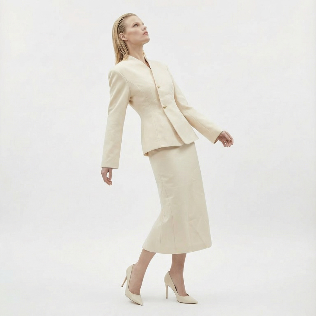 This two-piece set is crafted from high-quality gabardine fabric, known for its smooth texture, durability, and flawless tailoring. The clean lines and sculpted silhouette create a timeless yet powerful look. Every detail is thoughtfully designed with love and precision.